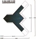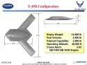 | Version: | X-45 A | X-45 B | X-45 C | Manufacturer: | Country: | Type: | Propulsion: | Honeywell F124-GA-100 (1x) | Engine thrust: | 6,300 lbs || 28 kN | Length: | 26.3 ft || 8.02 m | 36 ft || 9.6 m | 39 ft || 11.7 m | Height: | 3.7 ft || 1.13 m | Wingspan: | 33.8 ft || 10.30 m | 47 ft || 14.3 m | 49 ft || 15 m | Weight (Take-Off): | 12,000 lbs || 5,529 kg | 36,500 lbs || 16,556 kg | 36,000 lbs || 16,329 kg | Max. Speed: | 0.75 Mach | Range: | 1,300 nm || 2407 km | Ceiling: | 35,000 ft || 10,670 m | 45,000 ft || 13,720 m | 40,000 ft || 12,000 m | Crew: | Unit cost: |