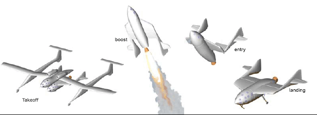 The unique configuration allows aircraft-like qualities for boost, glide, and landing.The ship converts (pneumatic-actuated 'feather') to a stable, high-drag shape for atmospheric entry.